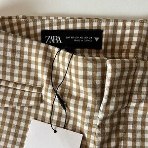 ZARA gingham capri pants in a tan and white check pattern. Features a cropped capri length with small side slits at the hem for an elevated, tailored look. Lightweight and perfect for spring and summer outfits. Size XS. Brand new with tags attached.
