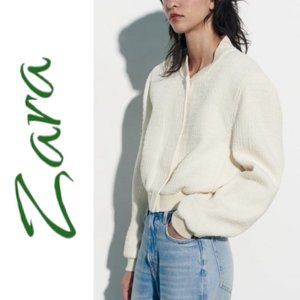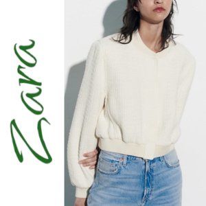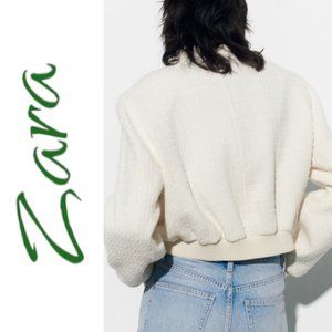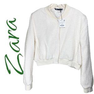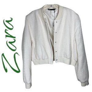 NWT ZARA Ivory Cropped Tweed Snap Front Bomber Jacket, Size Large