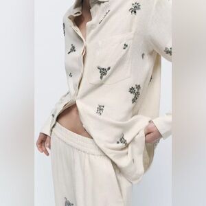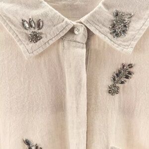 Linen blend shirt. Lapel collar and long sleeves with cuffs. Patch pocket on front. Embellished with contrasting jewels and beads. Front button closure with placket.
