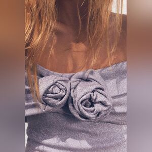 Top made with metallic thread knit fabric. Strapless with straight neckline. Matching interior lining. Self floral appliquรฉs.