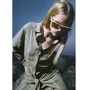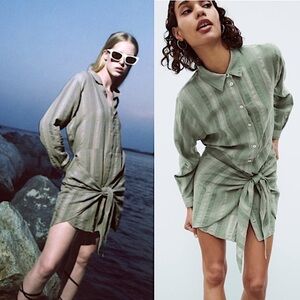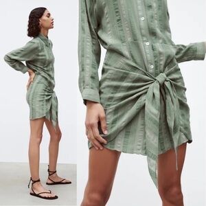 NWT ZARA Mini Dress Cotton Linen Sage Stripe Long Sleeve Tie Waist Shirtdress XS
