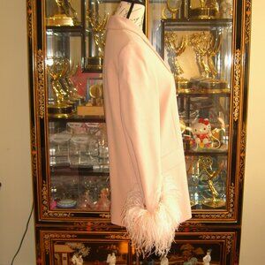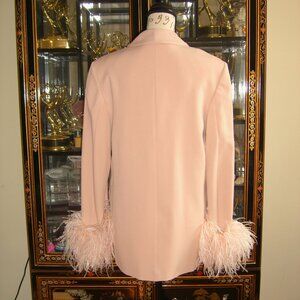 Beautiful pink nude blazer. Long sleeves with removable feather cuffs. Lapel collar. Flap pockets. Single button front closure. Made of viscose blend fabric. Lined. Brand new with tag.