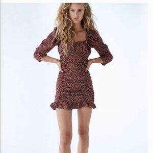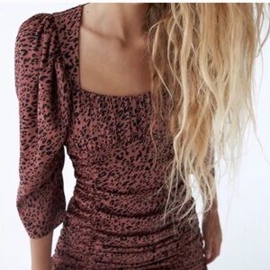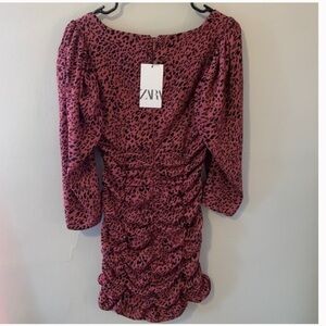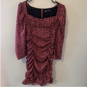 NEW with tags ZARA Pink Leopard Print Ruched Puff Sleeve Ruffle Mini Dress
