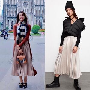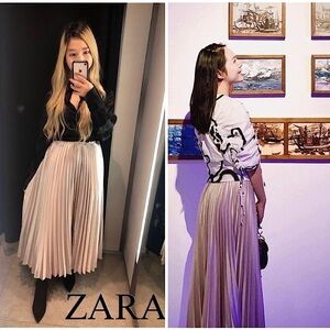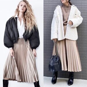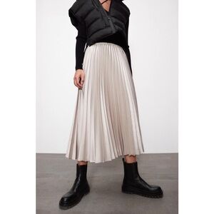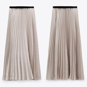 NWT ZARA Pleated Champagne Satin Gathered Waist Flared A-Line Y2K Midi Skirt L