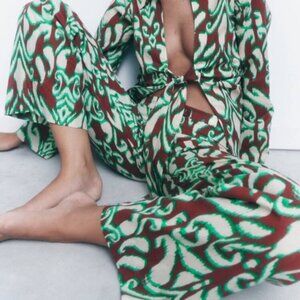 NWT ZARA Printed Pants Mid-Rise Straight Leg Front Zip and Button Closure Sz L