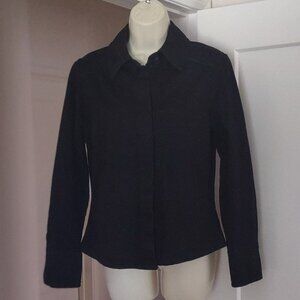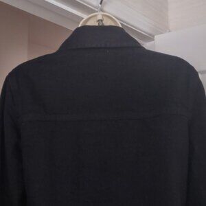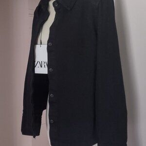 ZARA Slim Black Denim Shirt ZW Collection. Slim fit, shorter length. Looks great worn open as a jacket or buttoned up as a shirt. Lapel collar, long cuffed sleeves. Detailed black topstitching. Front hidden button closure. Fabric on the heavier side.