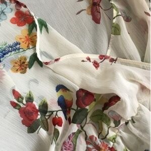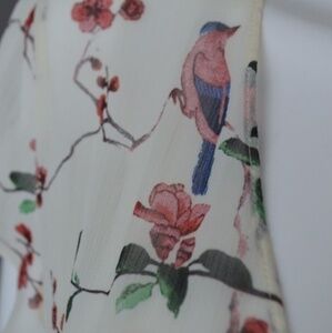 Beautiful and elegant oriental-style print with birds and vibrant flowers. V neckline, cinched waist, and sheer fabric.