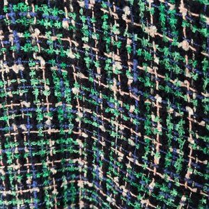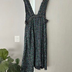 Tweed jumper overall dress with deep v neckline and wide straps with metal buttons