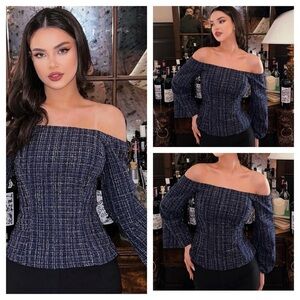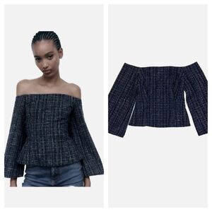 NWT ZARA Tweed Textured Off Shoulder Top Flare Long Sleeves size S