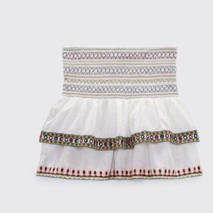 Short high-waist skirt featuring an elastic smocked waist with adjustable drawstrings and contrast embroidery detail.