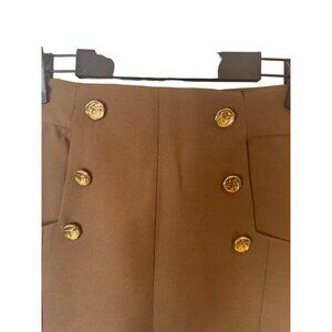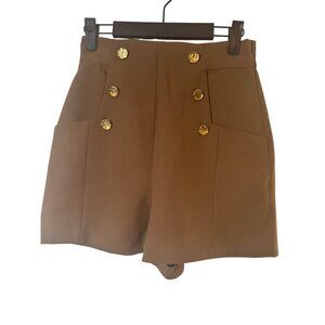 NWT Elevate your wardrobe with these stylish XS nutmeg brown high-waisted shorts. The luxurious polyester and viscose blend offers comfort and elegance, while the eye-catching gold button accents add a touch of sophistication. Featuring convenient side pockets, these shorts seamlessly blend fashion and practicality. Pair them with your favorite top for a chic, modern look.