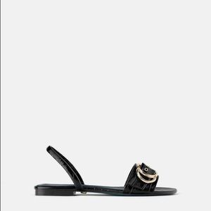 New with tags and box, Zara blue collection sandal. Black leather alligator with gold detailing! size 38 = 7 1/2, 8.