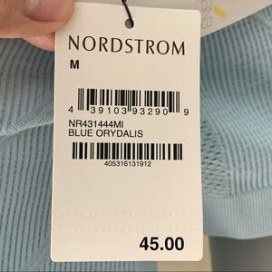 Size Medium. Brand new with all tags attached. Pristine condition. Very stretchy and form fitting. 97% Nylon, 3% Spandex. Ribbed design. Light blue color. Approximate measurements (taken when laying flat and not stretched- cannot guarantee fit):