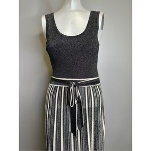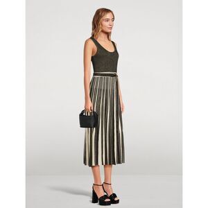 Colorblocked pleats bring swingy movement to the skirt of this tank-style sweater-dress illuminated with shimmering metallic fibers and finished with a coordinating sash.