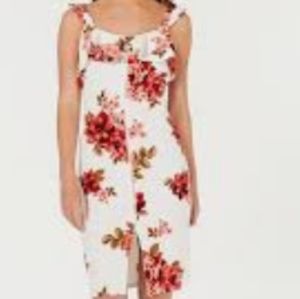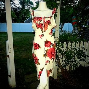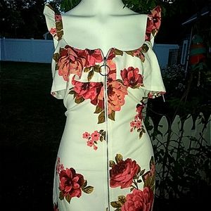 New tags crave Fame floral summer dress with zipper that unzips from the top to the bottom with a small 5" slit at the bottom. Beautiful ruffled straps very form-fitting bodycon dress new with tags from Macy's junior size extra large. I had better photos of this on my mannequin but I cannot sign them it truly is an amazing sexy dress. Chest is 18.5 armpit to armpit. The widest measurement at the hip is 21.5" and the dress is 32" long from the armpit to the bottom not including the straps.