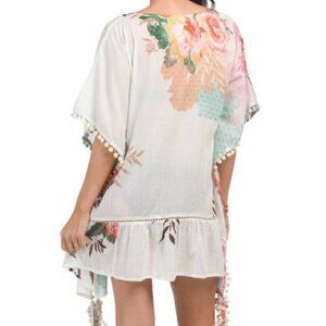 Z&L EUROPE Boho Floral Pom Pom Swim Coverup NWT! Gorgeous and Flowy Z&L Europe Boho Floral Swim Coverup Colorful Tropical Floral Print Lace-Up V-Neck with Colorful Stripe Trim Flirty Ruffle Hem with Multicolored Pom Pom Trim Detail 100% Cotton • Size: M • Excellent Brand New Condition • Can be used as a Kimono duster with a strappy blouse underneath • Color: White with Multicolored Floral Print •