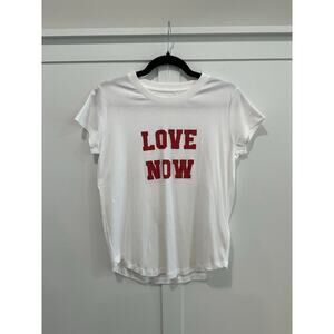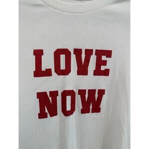 Retail price is $128. 100% cotton. Cap style shirt sleeves. Red glitter Love Now graphic. Curved hem.