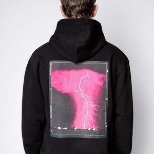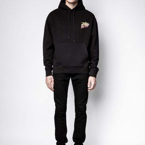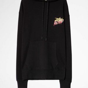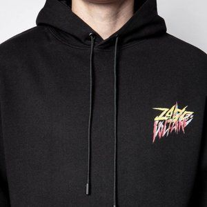 Zadig&Voltaire men's black hooded sweatshirt with crest on front and “Coup de foudre” photoprint printed on the back.
