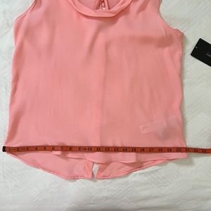 Pretty watermelon pink sheer sleeveless blouse has a fold down scoop neckline. It has buttons down the back with a two tie detail closure behind the neck. Wear by itself or under a jacket. Beautiful color would look great with any neutral bottom. Perfect for the current pink trend!