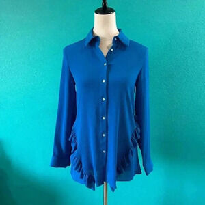 NWT Zara Basic Blue Mesh Ruffled Long Sleeve Button-Down Shirt Size XS