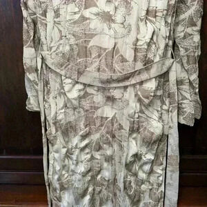 This is a new with tags Zara long-sleeved dress in a beige and white floral print. The dress has a round neckline, a relaxed fit, and a tie belt at the waist. The fabric is a soft and lightweight blend of materials. The dress is approximately 40 inches long and has a 38 inch bust. The dress is in excellent condition with no visible imperfections. It comes with the original tags and is ready to be worn.