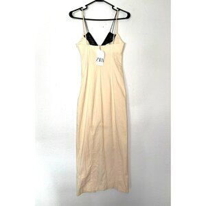 NWT Zara Beige Midi Slip Dress With Black Lace Trim & Double Straps Size XS