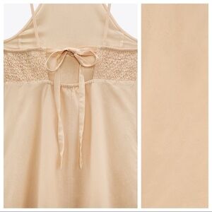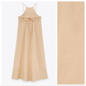 NWT. Zara Beige-Pink/Peach Linen Blend Embroidered Midi Dress with straight neckline, spaghetti straps, front contrasting embroidery details, back smocked elastic fabric details, back opening and tie closure, lined. Size M. Ref. 7200/114. Pit to pit 16" flat, waist 17,5", length 50". 1072.