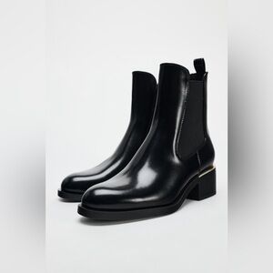 NWT. Zara Black Faux Leather Ankle Boots with Metallic Plate detail on the back. Elasticated side panels. Pull tab on the back. Round toe. Heel height: 5 cm. / 1.9". Size 10. Ref. 2150/410. SH5