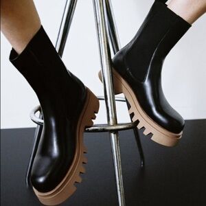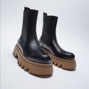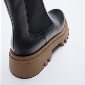NWT. Zara Black Flat Leather Ankle Boots with track soles, leather upper with elastic side gores, back pull tab, chunky track sole in contrast colour. AIRFIT®. Flexible technical latex foam insole, designed to offer greater comfort. Sole height: 4 cm. / 1.5″. Size 8. Ref. 1116/710. SH 5