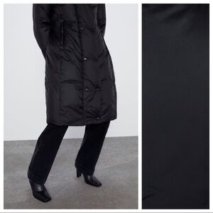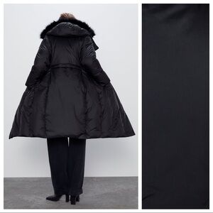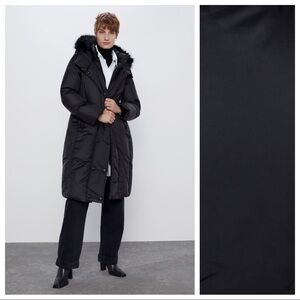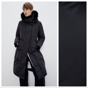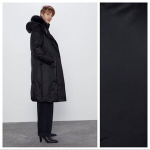 NWT. Zara Black Long Hooded Down Puffer Jacket made with feather and down padding, with a high neck, detachable hood with removable faux fur trim, long sleeves, front zipper and snap buttons closure, two front pockets. Size M. Ref. 8073/250. Pit to pit 22" flat, shoulders 16,5", sleeves 25", length 42".