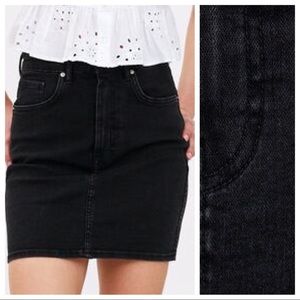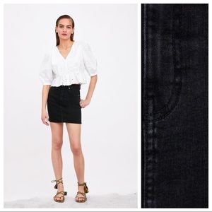 NWT. Zara Black Mini Hi-Rise Stretch Skirt with front pockets, front zipper and metal button closure. Size S. Waist 13" flat, length 15,5". 1023.