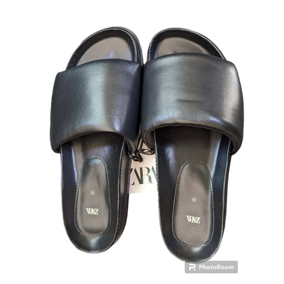 NWT Black leather padded slides/sandals/flats. Size 6.5 by Zara. (37)