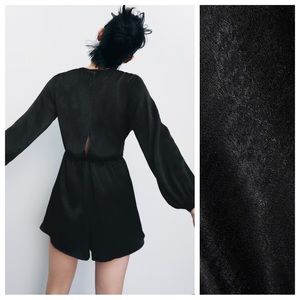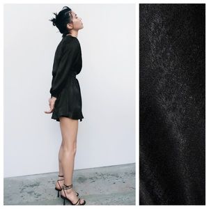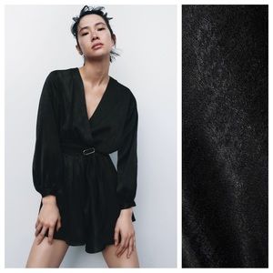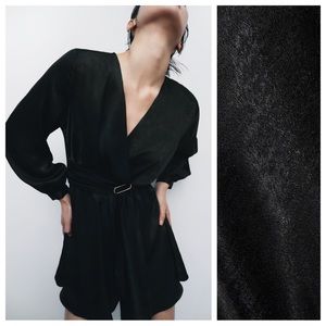 NWT. Zara Black Satin Effect Buckled Short Wrap Style V-neck Jumpsuit with long sleeves, elastic waist, front tie detail with gold buckle, back opening with button closure. Size M. Ref. 2119/608. Pit to pit 18" flat, shoulders 14,5", sleeves 22,5", waist 12,5", rise 16", inseam 4", length 31,5". 1077