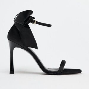 NWT. Zara Black Satin Effect High-Heel Shoes/Sandals with Bow. Maxi bow detail on the back. Thin strap on the front. Buckled ankle strap fastening. Heel height: 9 cm/3.5". Size 9. Ref. 2316/410. SH 13