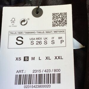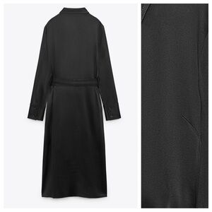 NWT. Zara Black Satin Effect Shirt Midi Dress with Belt, lapel collar, cuffed long sleeves, tied self belt. Pronounced topstitching detail. Front button closure. Size S. Ref. 2315/423. Pit to pit 18" flat, shoulders 14", sleeves 23", waist 16", length 49". 1075