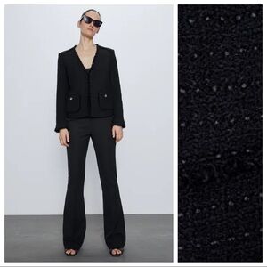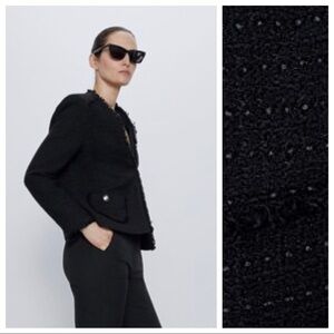 NWT. Zara Black Tweed Open Front Blazer with round neckline, long sleeves with pronounced shoulders, front flap pockets with metal buttons. Size S. Ref. 2444/159. Pit to pit 18,5" flat, shoulders 15", sleeves 23", length 24".