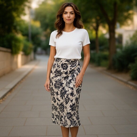 A stylish floral midi skirt with a ruched detail, perfect for adding a touch of elegance to your wardrobe. Comfortable and versatile design.