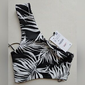 NWT - Zara Black & White Leaf Print One Shoulder Asymmetric Neckline Crop - Size