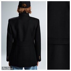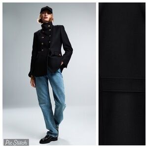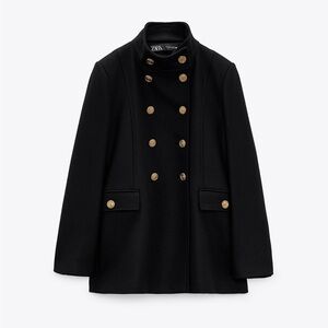 NWT. Zara Black Wool Blend Coat with Golden Buttons, collar and long sleeves with shoulder pads, front pockets with flaps, tab detail on the back, interior lining, front closure with golden buttons. Size XS. Ref. 9442/744. Pit to pit 16,5" flat, shoulders 13,5", sleeves 24", length 28".