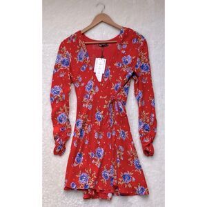 NWT Zara Blogger’s Favorite Red Floral Long Sleeve V-Neck Wrap Dress, Small