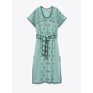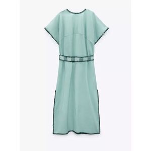 NWT Zara Blue Green Embroidered Belted Tunic Midi Dress, Size Small