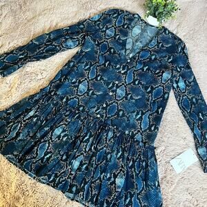NWT Zara Blue Snake Print Long Sleeve Button Front Lagenlook Dress Size Small