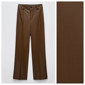 NWT. Zara BrownFaux Leather Francoise Full Length Straight Legs High-Waist Trousers with pronounced seam detail, front zipper fly and top button fastening. Size XS. Ref. 2969/058. Waist 13, 5" flat, rise 11,5", inseam 32".