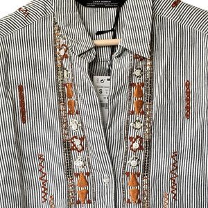 NWT Zara Collection S Striped Embroidered Embellished cotton Button Up Shirt