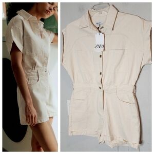 NWT Zara Cream Denim Playsuit Romper Size Large.