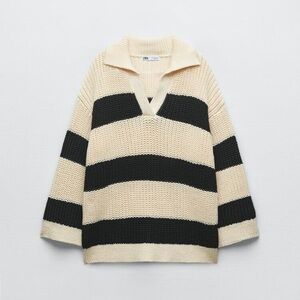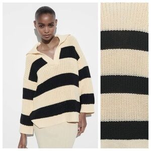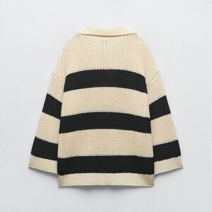 NWT. Zara Cream/Black Oversized Striped Sweater with V-Neck, lapel collar and long sleeves. Size M-L. Ref. 6771/029. Pit to pit 23" flat, shoulders 22,5", sleeves 16,5", length 26". JN1.