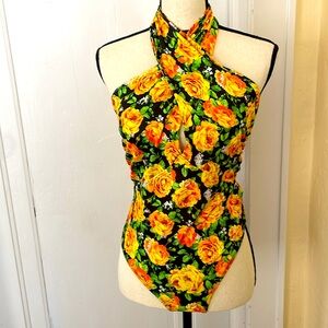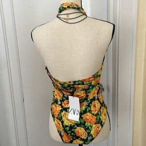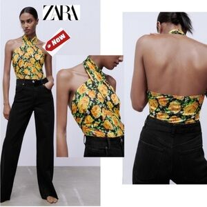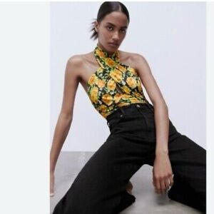 NWT Zara CrissCross HalterNeck Bodysuit Black/Yellow Floral SnapButtonTop Size M