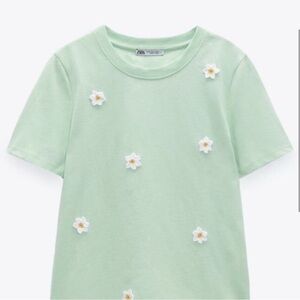 This NWT Zara Crocheted Daisies Women's T-Shirt Small is brand new with tags. Charming mint green tee with delicate floral embroidery. Ideal for casual outings.