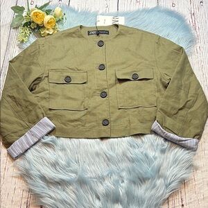 NWT Zara Cropped Linen Blend Jacket with Contrast Cuffs Sz S