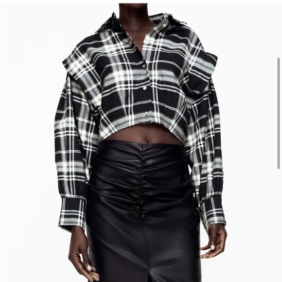 NWT Zara Cropped Plaid Flannel Shirt Crop Top Oversized Button Up Long Sleeve L